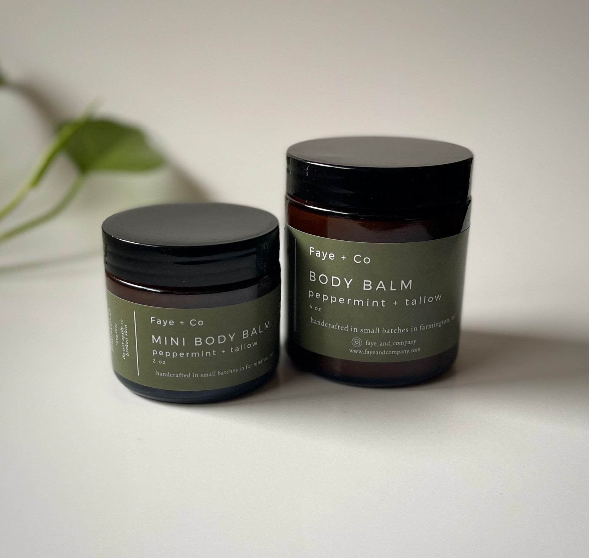our Body Balm is made with grass-fed tallow, nilotica shea butter, and jojoba oil, so it's loaded with nourishing vitamins, minerals, and protective fats. the invigorating peppermint scent is the perfect pick-me-up for your skin, and refreshing to your senses.